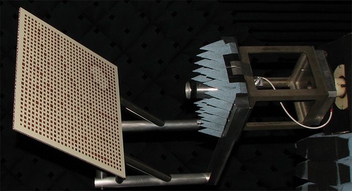 A planar pencil-beam reflectarray in an anechoic measurement chamber.